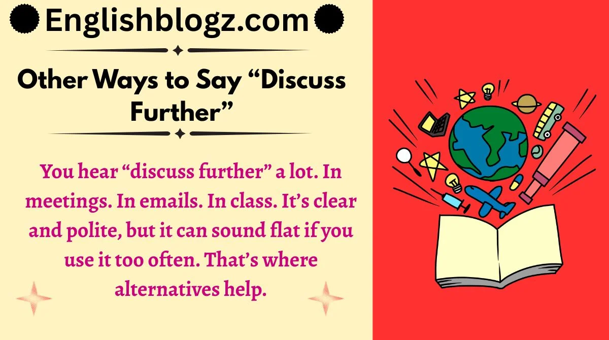 You hear “discuss further” a lot. In meetings. In emails. In class. It’s clear and polite, but it can sound flat if you use it too often. That’s where alternatives help.