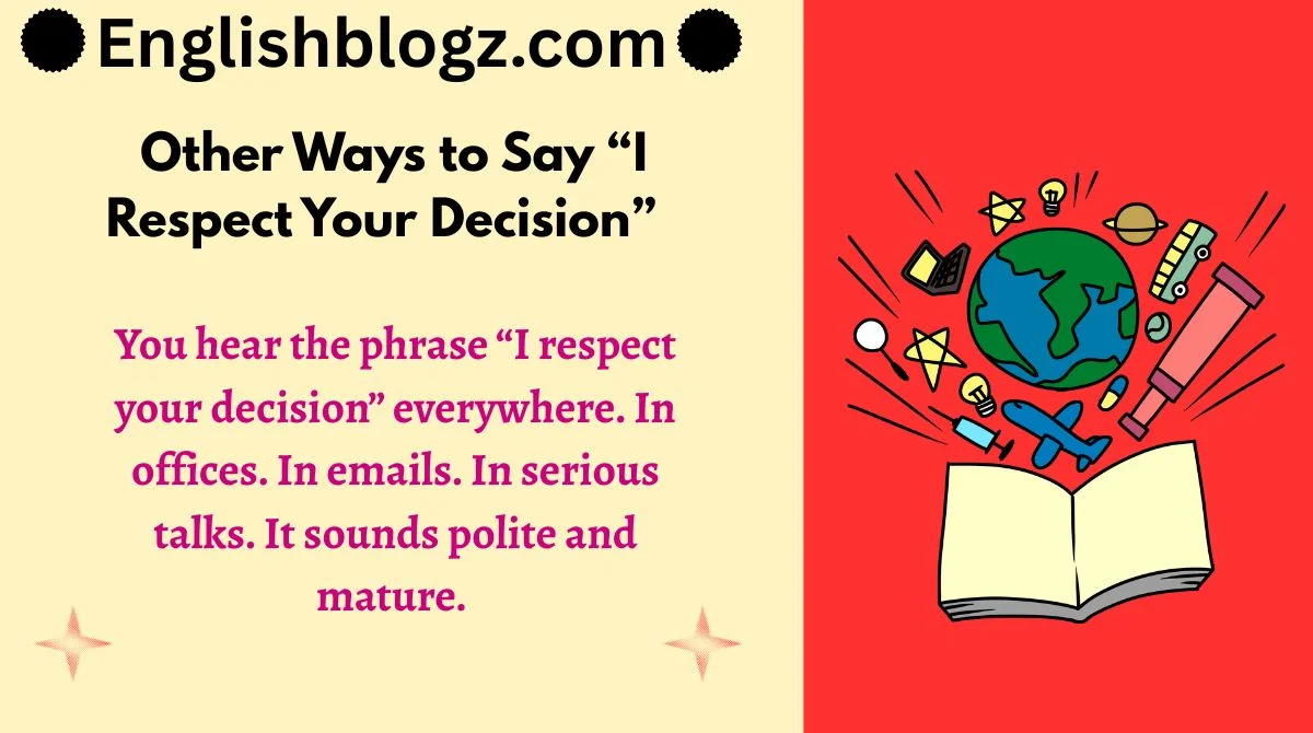 Strong communication depends on choice of words. Saying “I respect your decision” works, but variety makes your English sound natural and confident.
