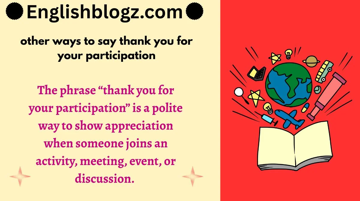 The phrase “thank you for your participation” is a polite way to show appreciation when someone joins an activity, meeting, event, or discussion.
