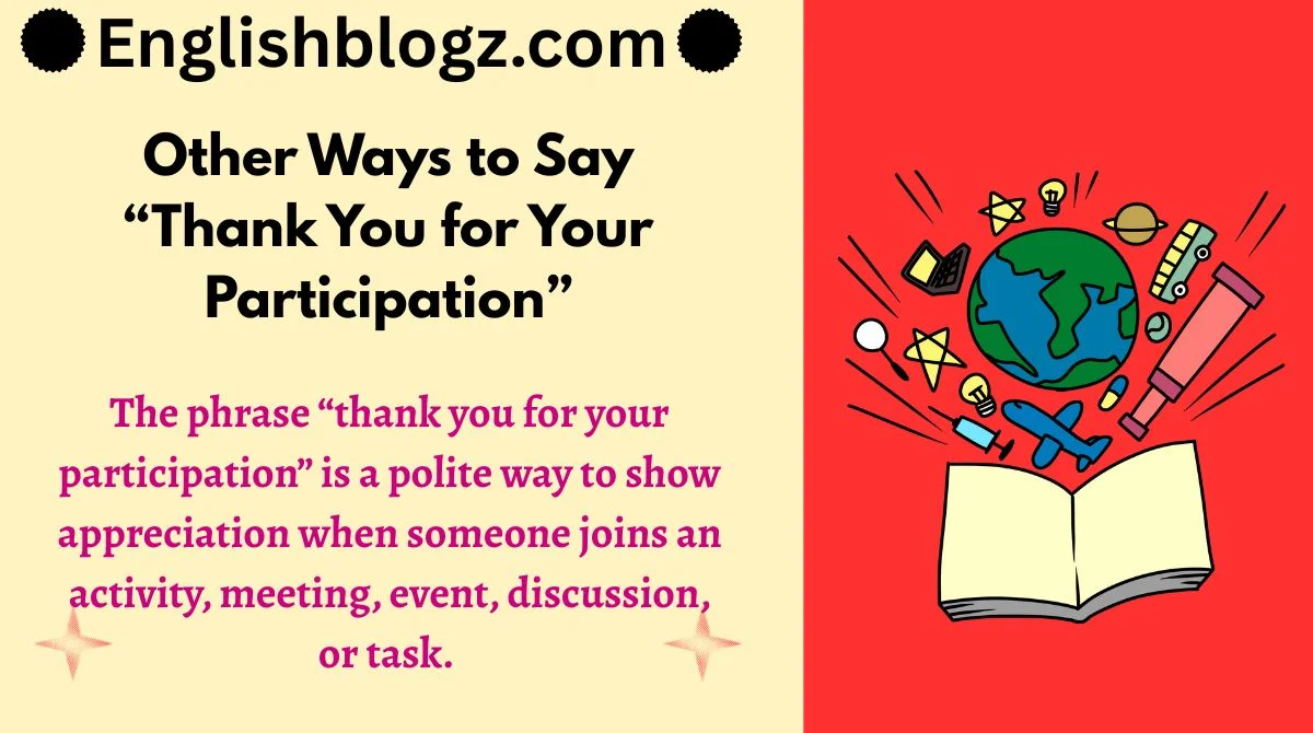 The phrase “thank you for your participation” is a polite way to show appreciation when someone joins an activity, meeting, event, discussion, or task.